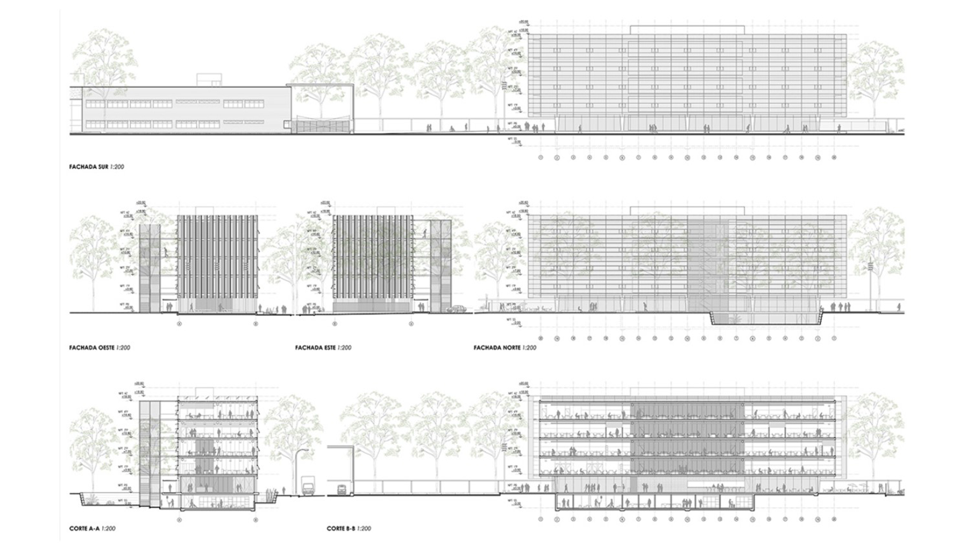 La propuesta se desarrolla en dos volúmenes en tira paralelos a la calle, de
