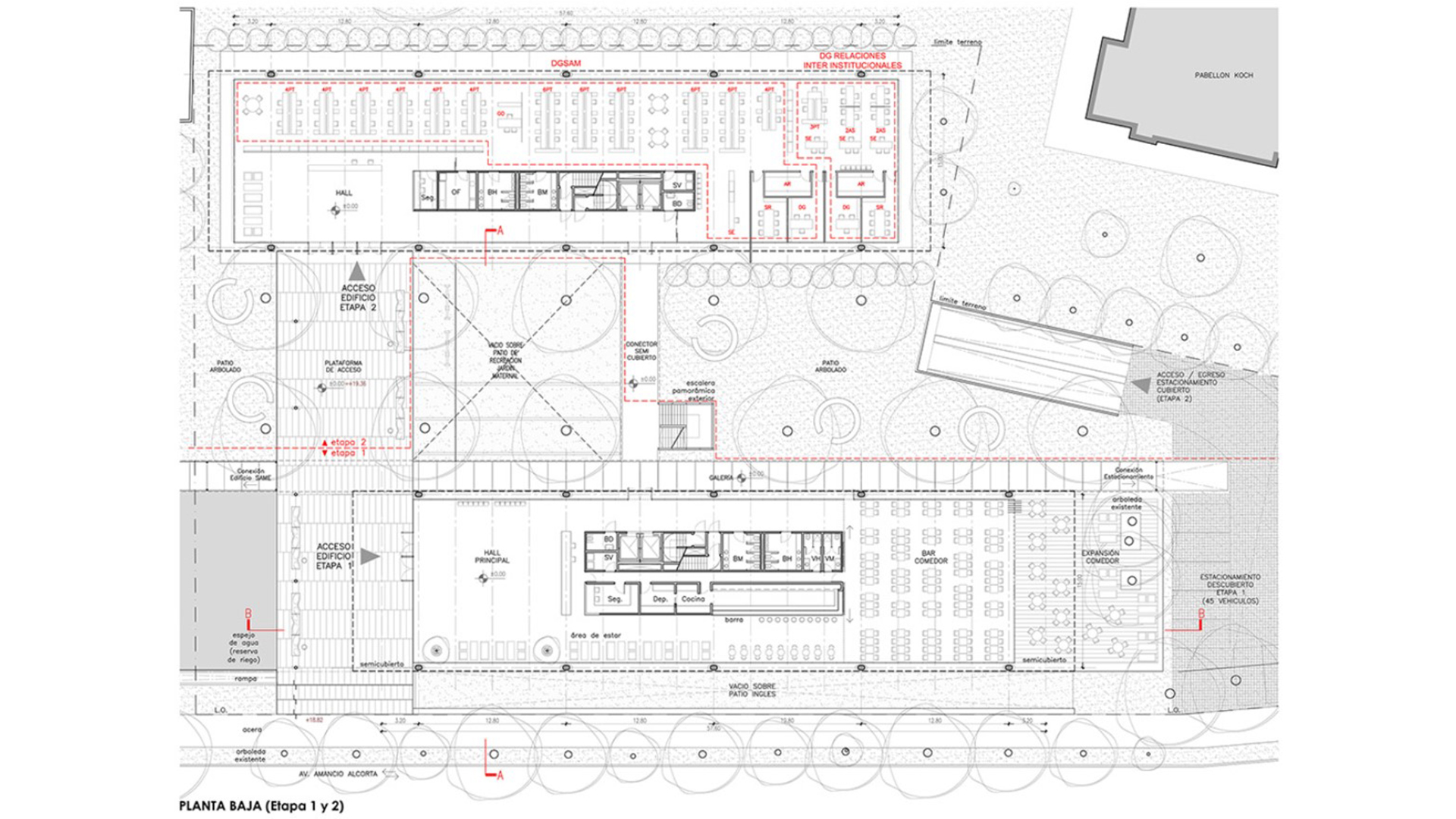 retiro hacia el Pabellón Koch. El Edificio 1 se dispone en el volumen hacia la